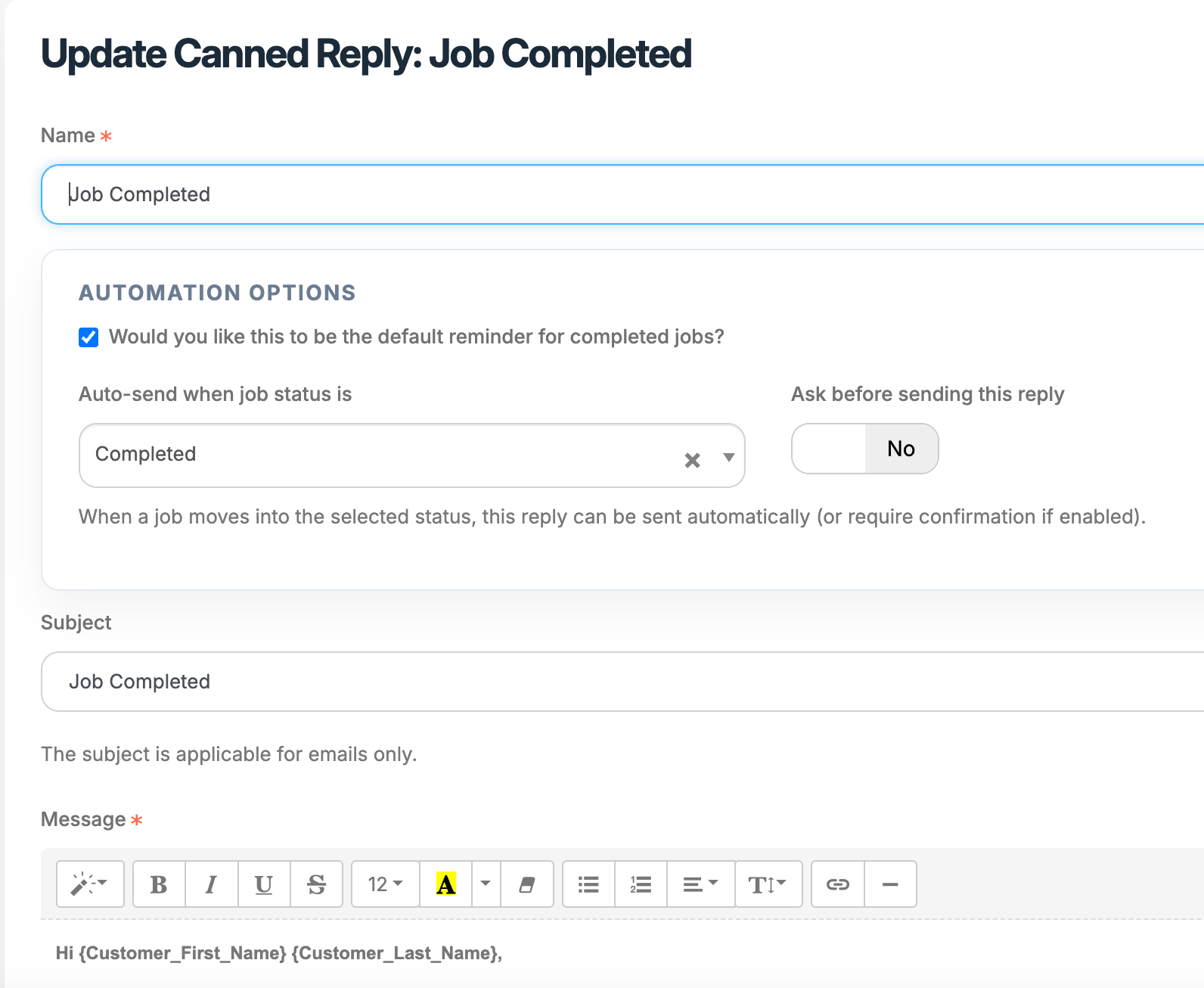 Customise messages per status, include job ID, customer name, store info, and more