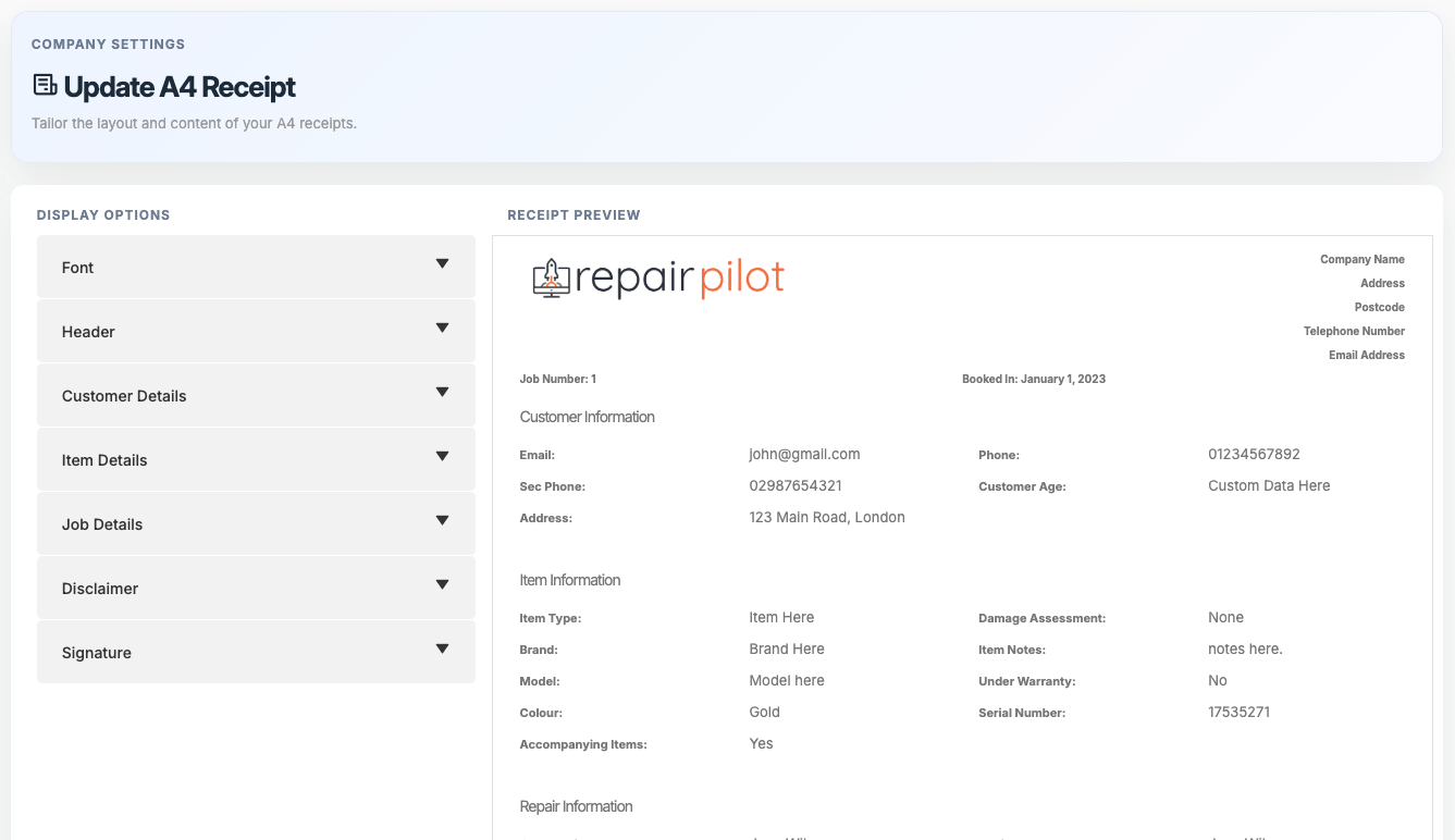 Every repair business is different. That’s why Repair Pilot lets you fully customise the platform to match your branding, your processes, and the way your team works.